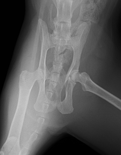 レントゲン検査で、左側の仙腸関節離断と同側の寛骨臼の骨折をしていることがわかりました。 寛骨臼の骨折は坐骨からの斜骨折を伴うもので、人の下顎骨骨折に用いられるMatrix Mandibleというプレートで整復しました。